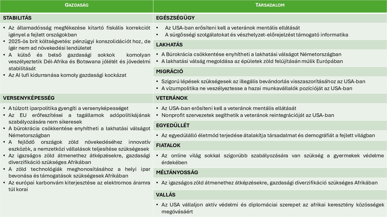 A társadalommal kapcsolatban 10 téma volt az elemzések fókuszában 2025. novemberében: az egészségügy, lakhatás, migráció, veteránok, egyedüllét, a fiatalok digitális kitettsége, igazságos zöld átmenet és az afrikai keresztények védelme.