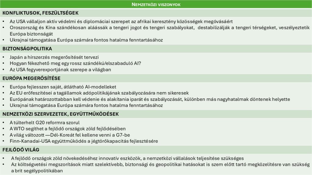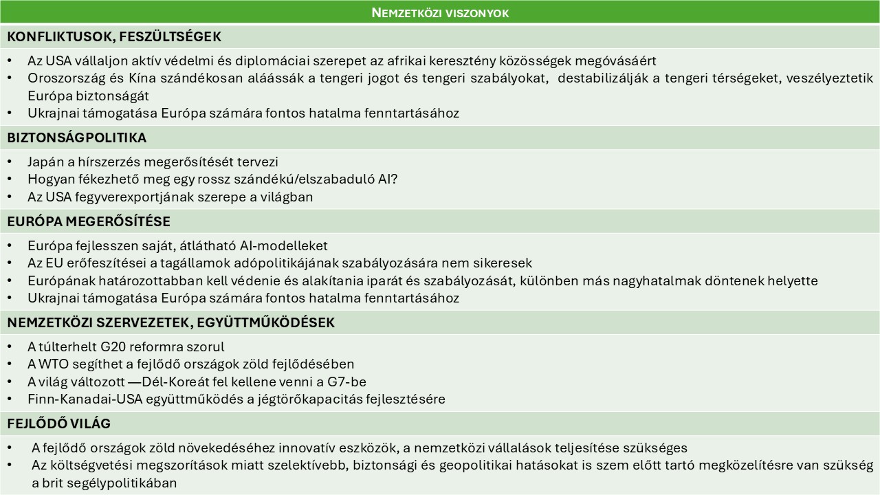 - Az nemzetközi szervezetek átalakításának kérdése (G7, G20, WTO, fókuszált államközi együttműködések) egyre komolyabb teret követel. Ez arra utal, hogy a globális kormányzás átalakulása javában folyik.