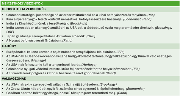 Továbbra is a hatalmi játszmák határozzák meg a nemzetközi környezetet, ugyanakkor a helyi szinten kibontakozó, gyakorlati megoldáskeresés biztató jel. A februári elemzések üzenete, hogy a tartós bizonytalanság közepette a siker kulcsa az alkalmazkodóképesség erősítésében, a mozgástér tudatos bővítésében és az új viszonyokhoz alkalmazkodó intézmények kialakításában lehet.