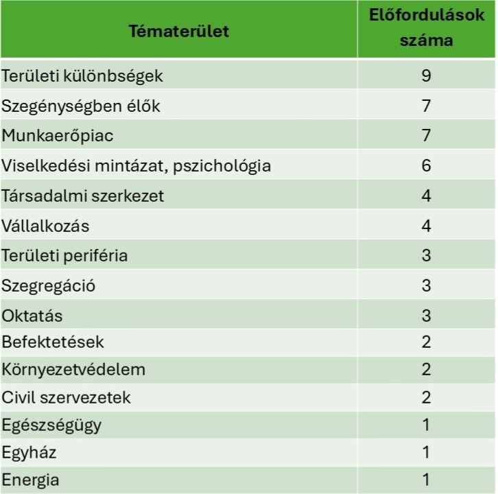 A területi különbségek, a szegénység és a munkaerőpiac a három legmarkánsabb téma a társadalmi, gazdasági elemző világban. A cikkek tematikus fókuszát a következő táblázat mutatja be.